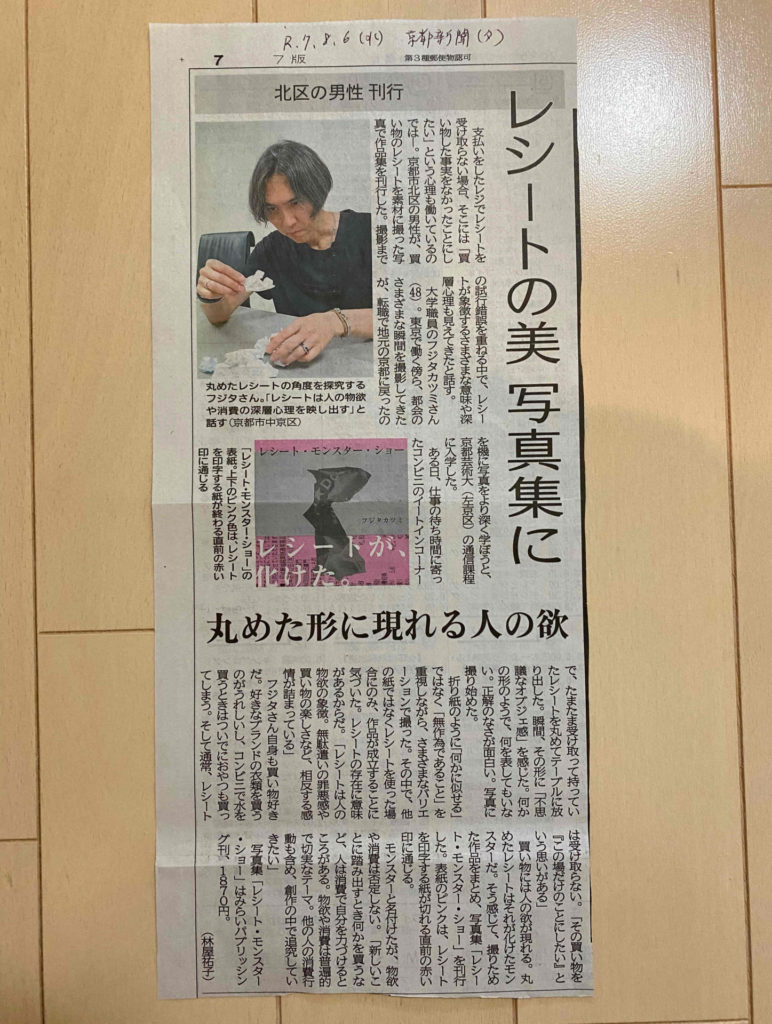 遅くなりましたが、早稲田大学京都校友会幹事で大学職員のフジタカツミさんが初写真集『レシート・モンスター・ショー』を上梓されたという記事が、去る8月7日(木)の京都新聞夕刊に掲載されました。